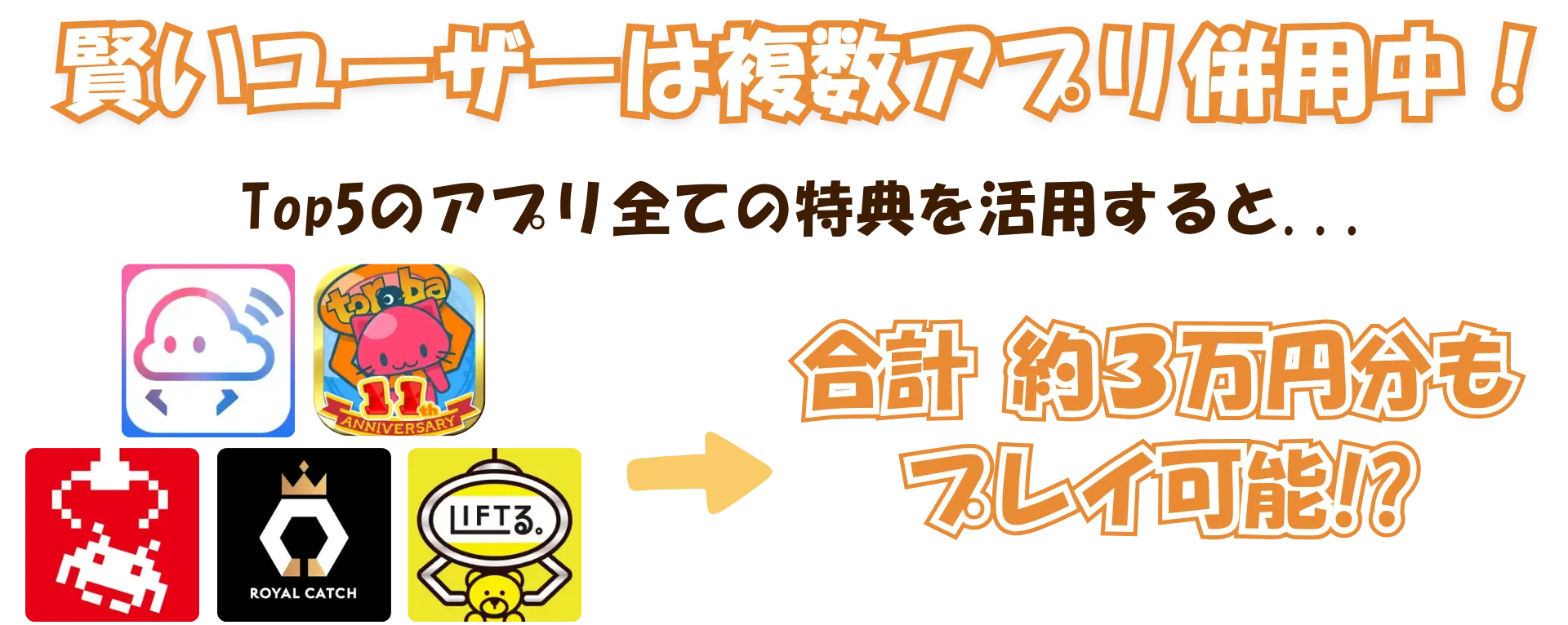 獲りやすさ、景品、コスパが違うので、複数アプリをダウンロードしてお気に入りを見つけよう!